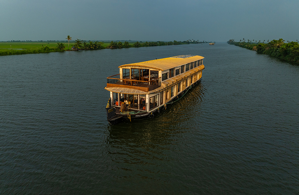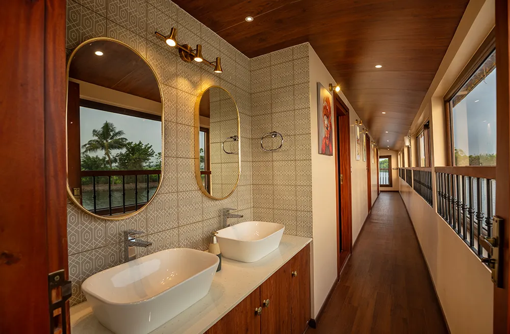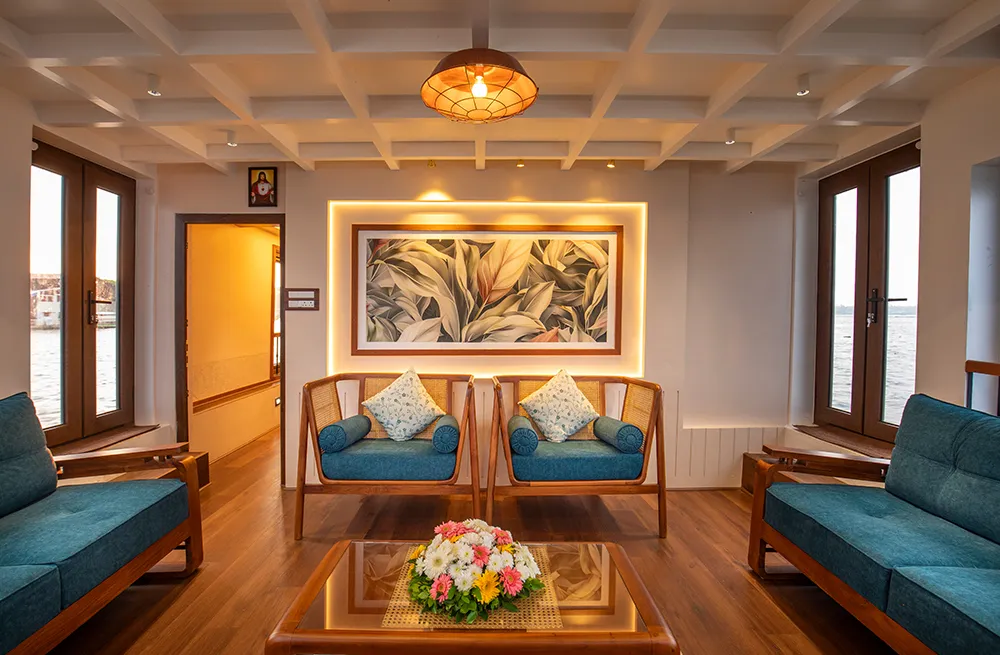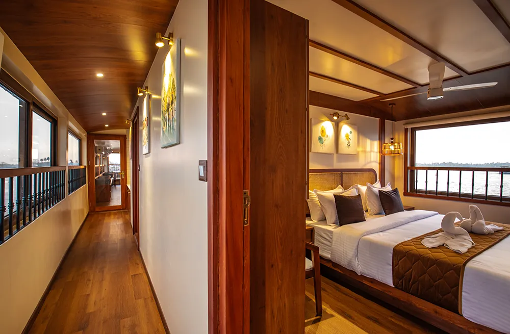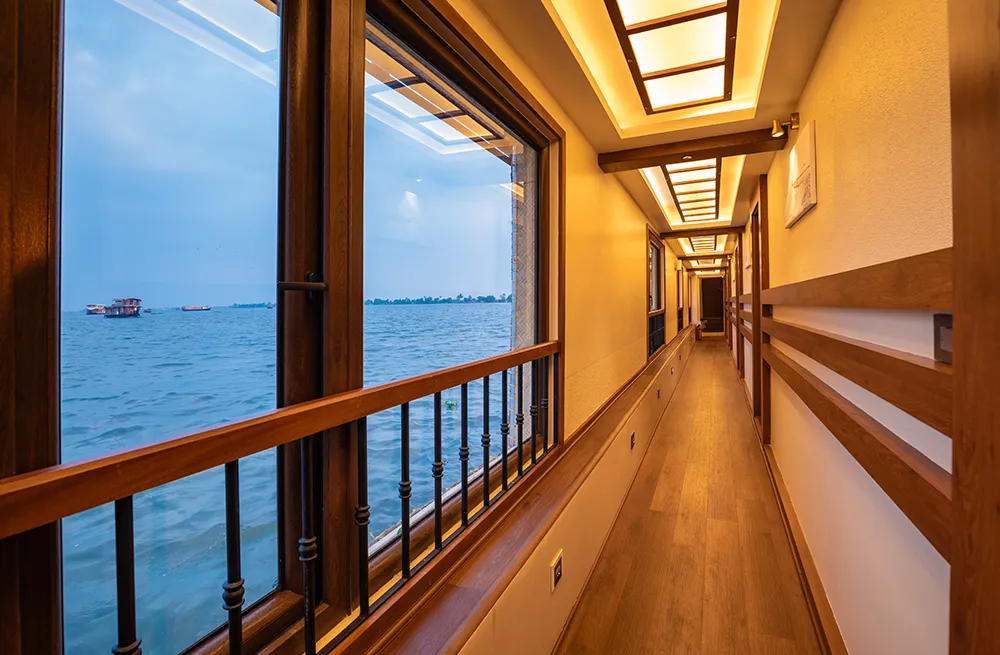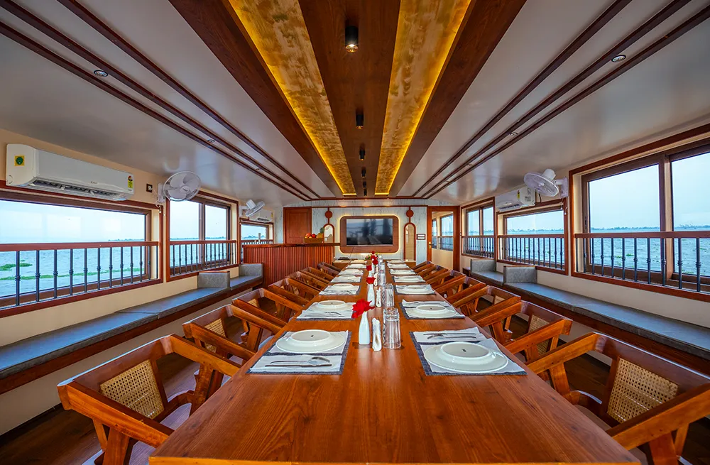 Welcome aboard Riverine Classic, our newly launched ultra-luxury double-decker houseboat featuring 8 well-furnished bedrooms designed to rival star-class hotels. Enjoy wooden interiors, modern amenities, and stunning views through clear glass sliding doors. Relax in the elegant lobby, dine in style, and unwind on the open deck as you cruise through serene waters. Experience unmatched comfort, class, and scenic beauty. Riverine Classic redefines luxury cruising.