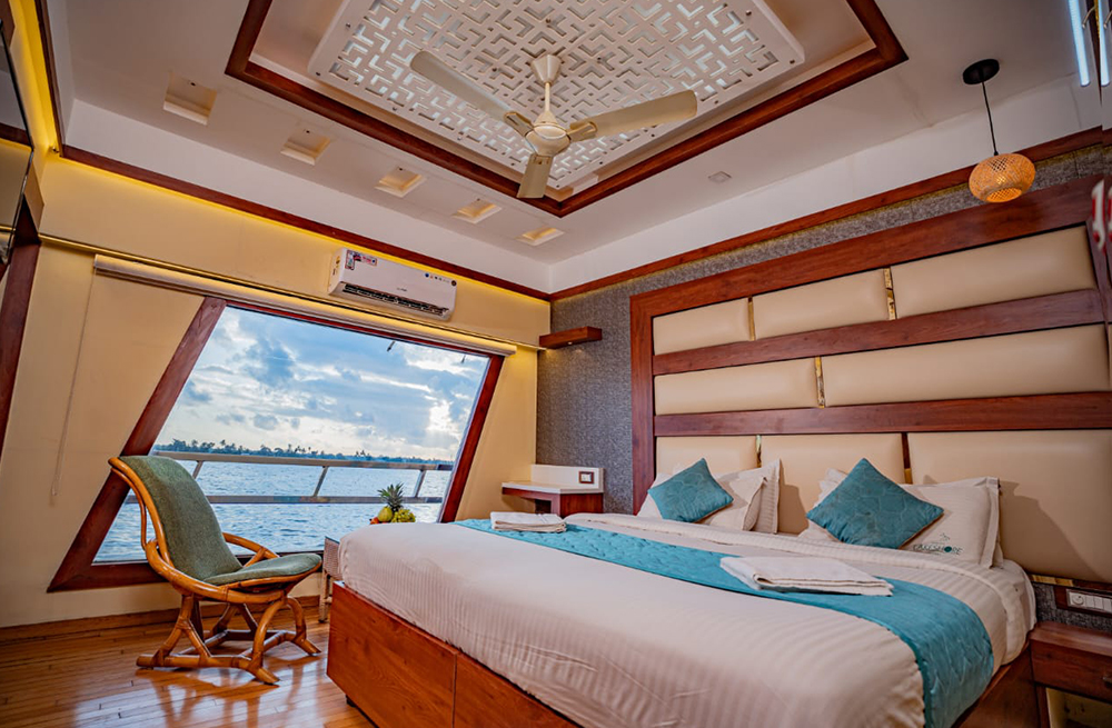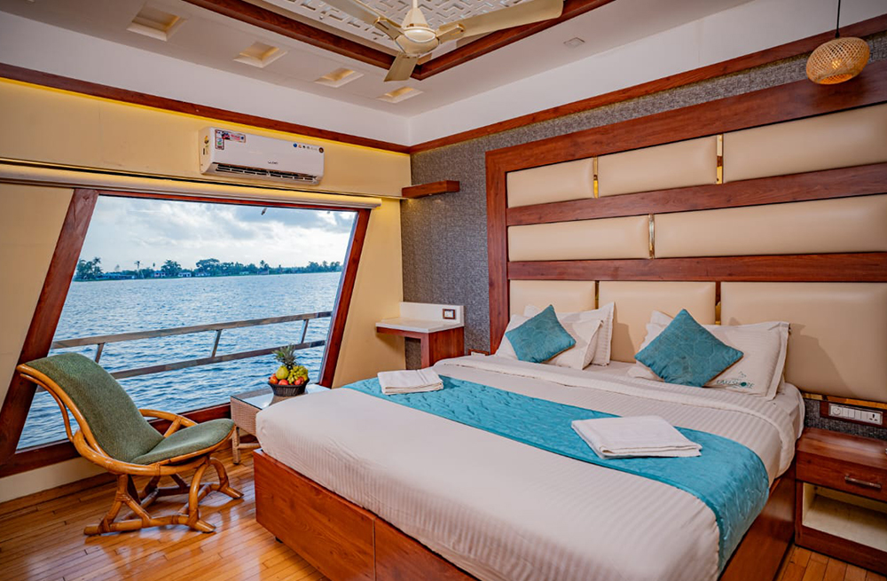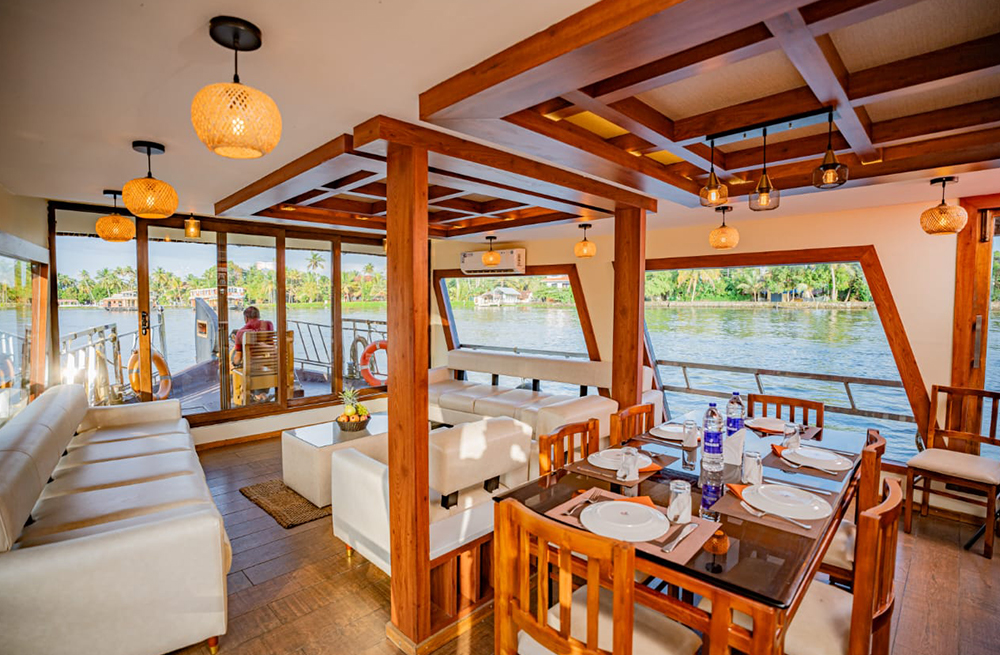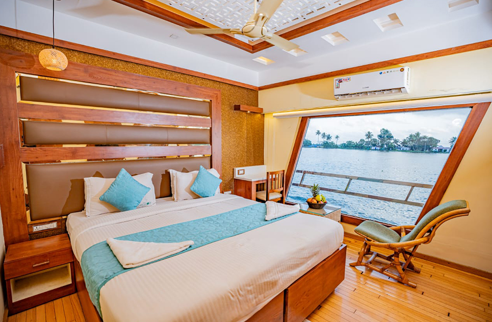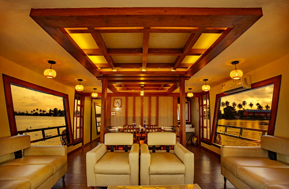 Step into Lakeshore, the ultra-luxury houseboat crafted for premium travellers. This elegant double-decker features a chic lobby, stylish dining area, and three beautifully furnished rooms on the ground floor. The upper deck offers panoramic views of the tranquil backwaters, blending luxury with the natural beauty of the surroundings. Experience top-tier service, comfort, and scenic beauty. Lakeshore is your perfect escape on the water.